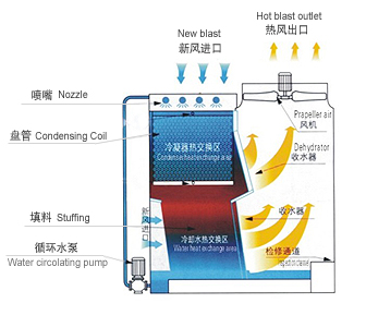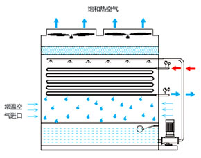 工作流體(水,油或其他液體)在盤管中流動(dòng),盤管外壁被噴淋水包裹,流體的熱量通過管壁傳遞,與水和空氣行程飽和濕熱蒸汽,熱量由風(fēng)機(jī)排入大氣,噴淋水在循環(huán)的過程中通過PVC散熱片降低溫度,與新鮮入風(fēng)形成風(fēng)水同向流動(dòng),盤管主要依靠濕熱熱傳導(dǎo)方式,這樣的運(yùn)行原理的重要特點(diǎn)就是可能抑制盤管外壁的水垢生成。